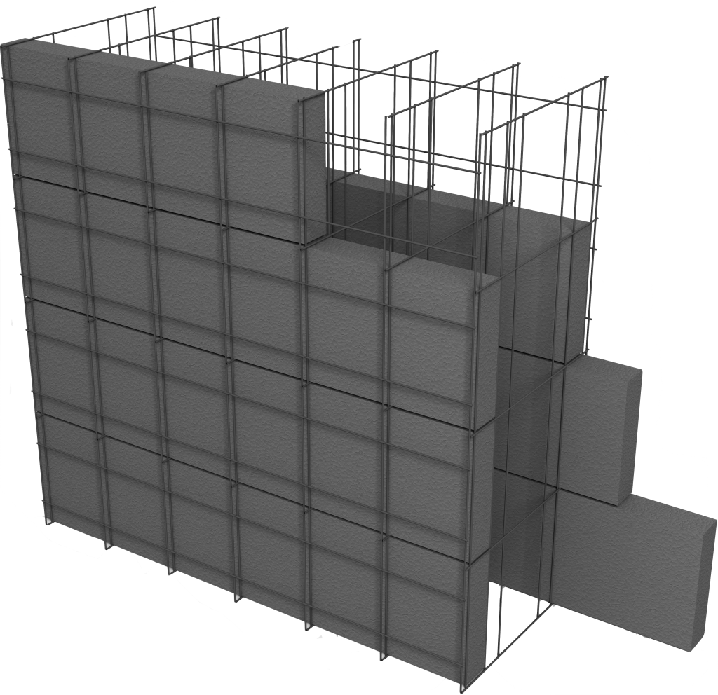 Sin embargo, la configuración fundamental de todos los módulos y de nuestro sistema de construcción en sí es la misma: un módulo de tres dimensiones, compuesto por una malla de acero galvanizado. Esta malla funciona como protección y sujeción para los elementos de acabado de la construcción. Por la parte exterior van incorporados paneles de relleno que convierten esta configuración en una estructura cerrada que se rellena internamente con hormigón.
